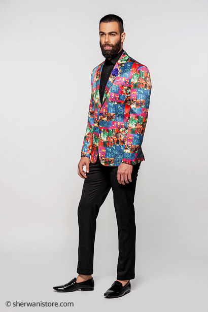 Party Blazer with Trouser Men Multicolor Printed Polyester Viscose Fabric